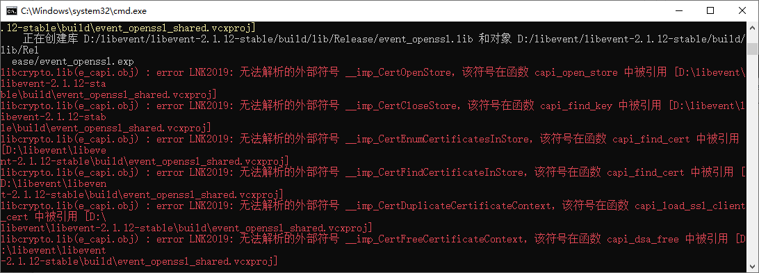 D:\libevent\libevent-2.1.12-stable\build\bin\Release\event_openssl.dll : fatal error LNK1120: 7 个无法解析的外部命令 [D:\libevent
