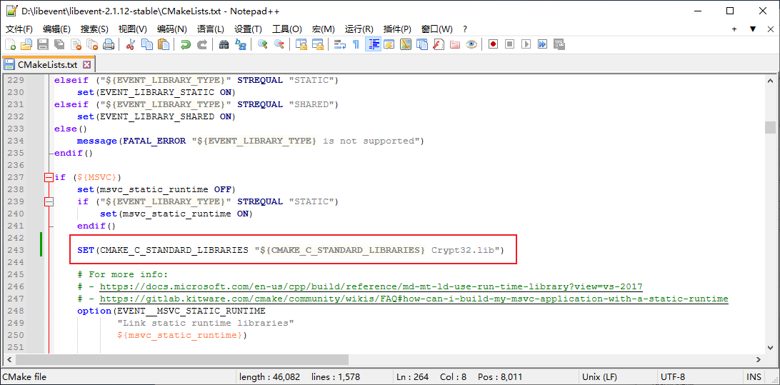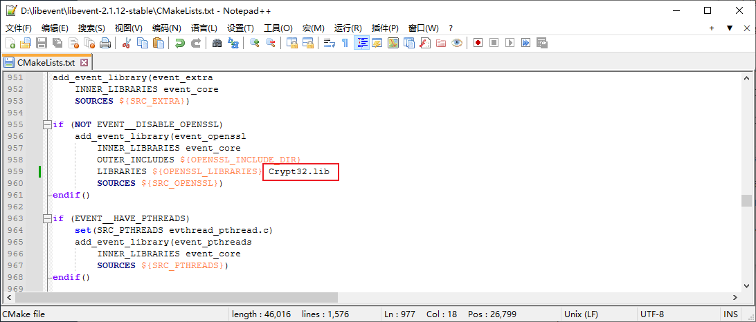 如下图所示,我们在libevent的CMakeLists.txt文件中追加 Crypt32.lib :