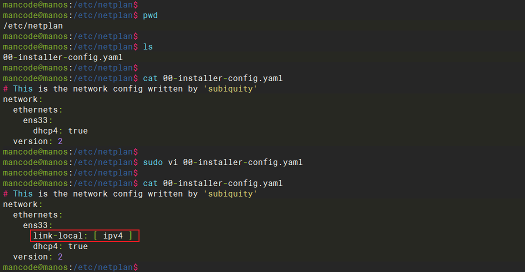 使用方法如下图所示,在ens33的配置项中,添加 link-local: [ ipv4 ]: