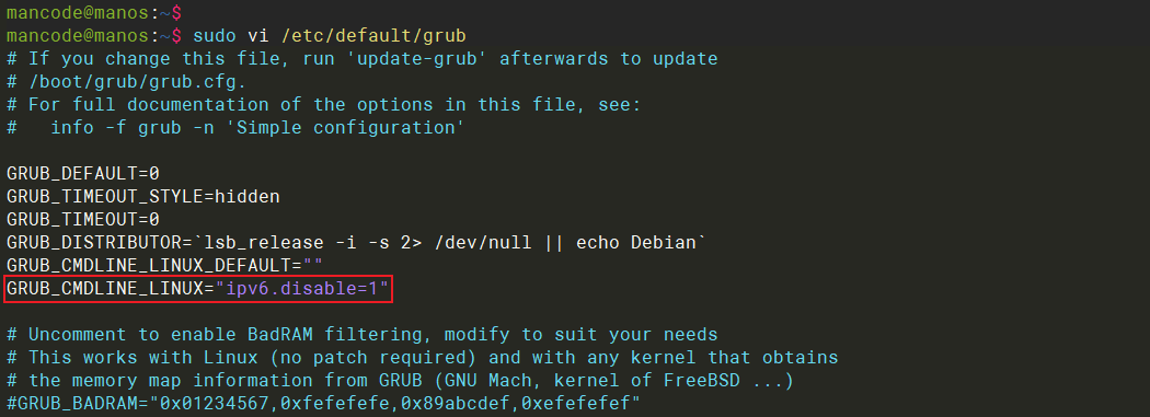 配置GRUB,使其在系统启动时向内核传递参数,禁用IPv6。