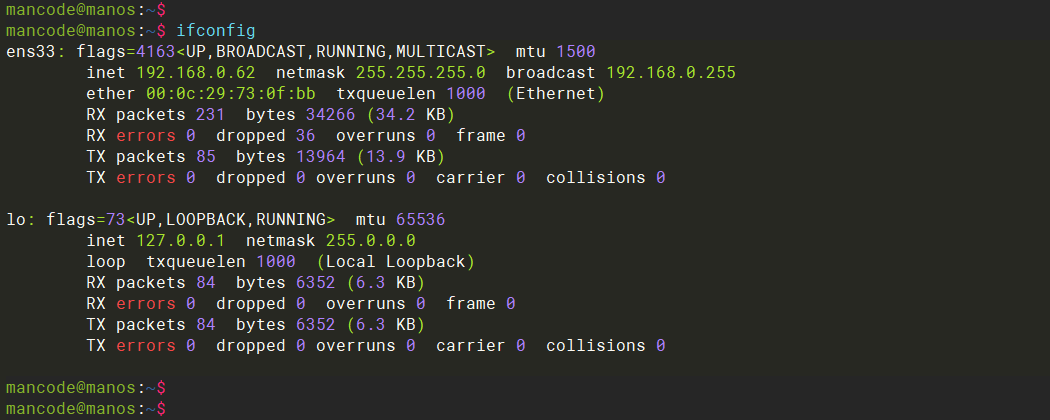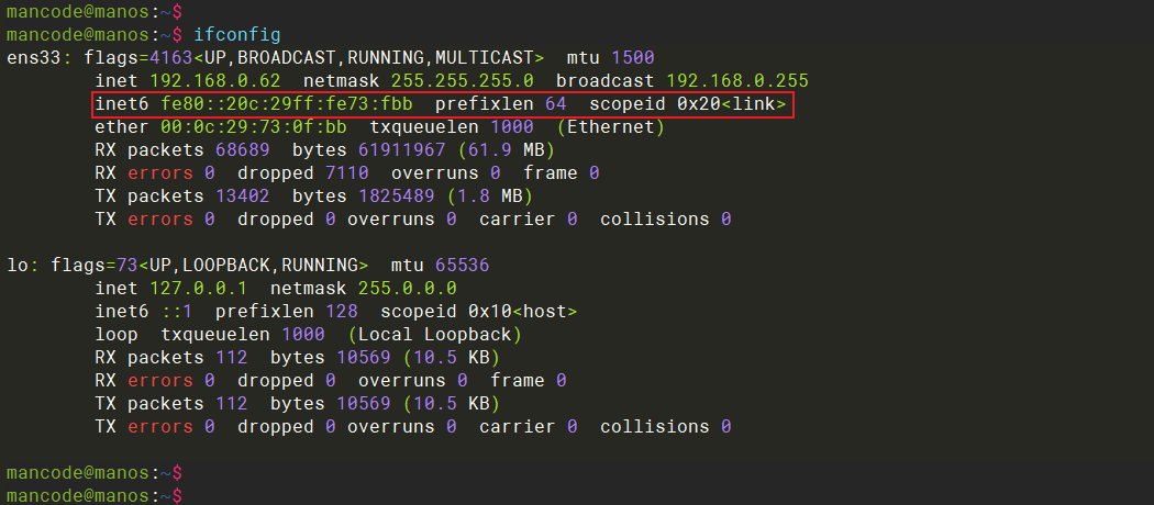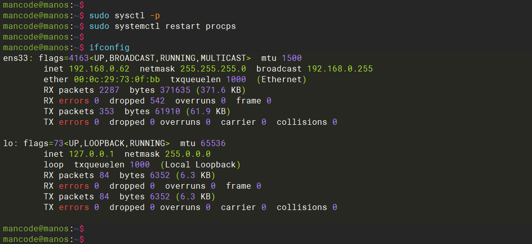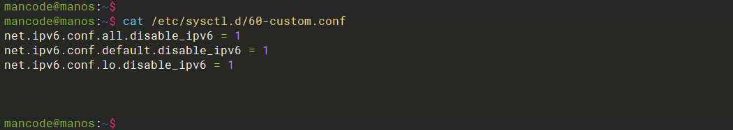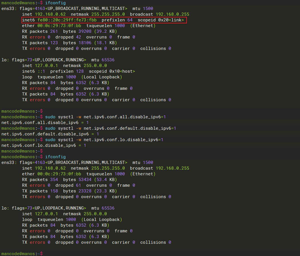 至此,我们再次重启之后,将会发现网卡已经不再有IPv6地址了,从而达到了我们永久禁用IPv6的目的。
