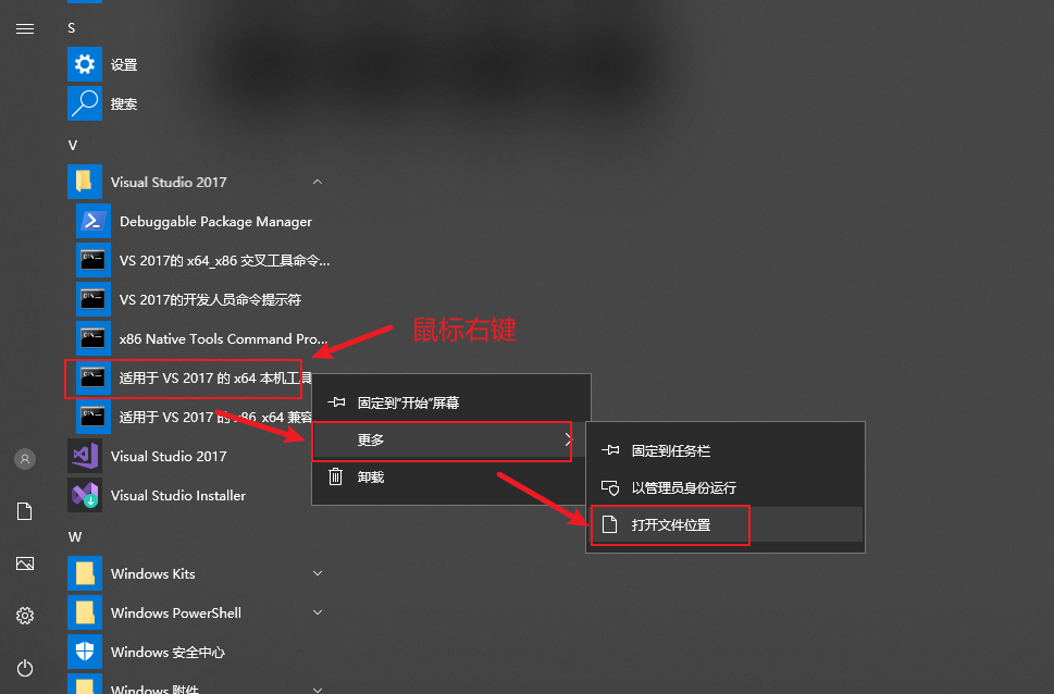 在“开始菜单”中找到“适用于VS2017的x64本机工具命令提示”,然后鼠标右键,打开程序所在位置,操作如下图所示:
