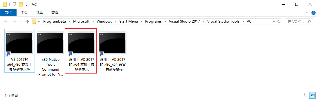 找到“适用于VS2017的x64本机工具命令提示”的程序位置