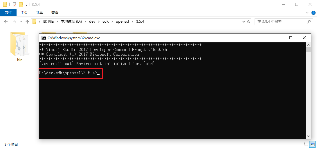 点击 “适用于VS2017的x64本机工具命令提示” 后,会看到操作系统打开如下窗口,并且CMD窗口所在的工作目录设置为当前目录: