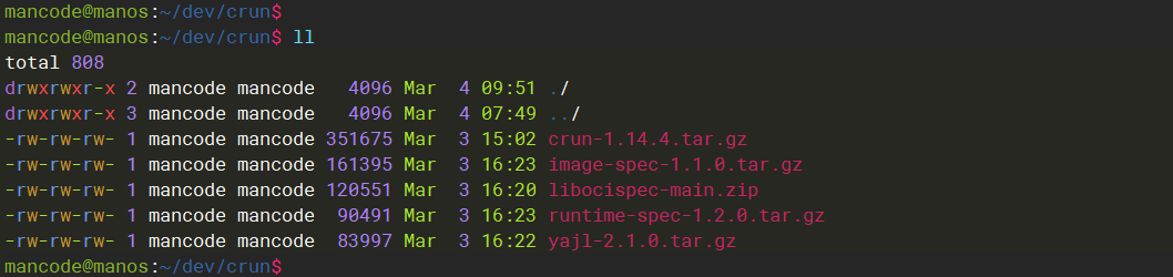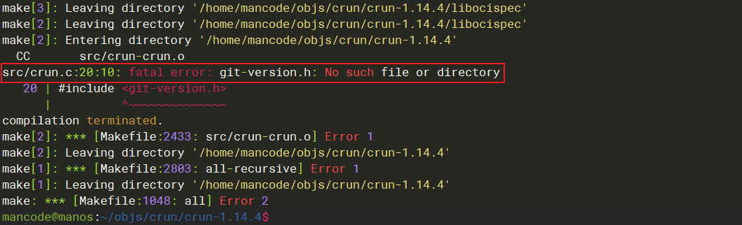 明白上述原因之后,我们来总结下: clone项目代码的方法很容易生成 git-version.h,而使用release包来编译crun,需要我们按照 git-version.h 的文件内容格式,手工添加 .tarball-git-version.h 文件,然后让make命令顺利执行,生成 git-version.h 文件后,编译成功。