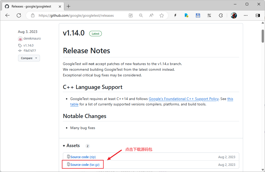。如下图所示,我们下载当前的最新版本v1.14.0,点击下载链接,完成后再将源码包googletest-1.14.0.tar.gz上传至服务器。