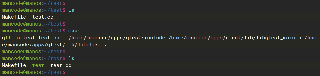 | mancode@manos:~/dev/gtest/googletest-1.14.0$