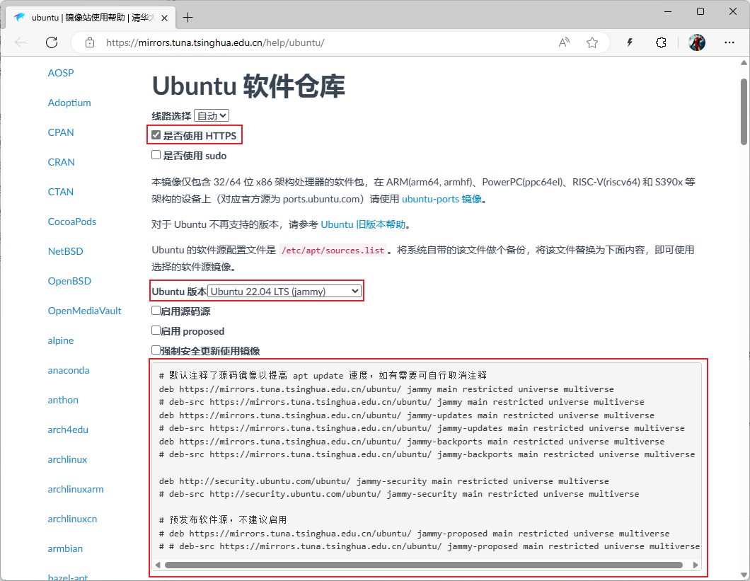 仓库地址:https://mirrors.tuna.tsinghua.edu.cn/ubuntu 或者
