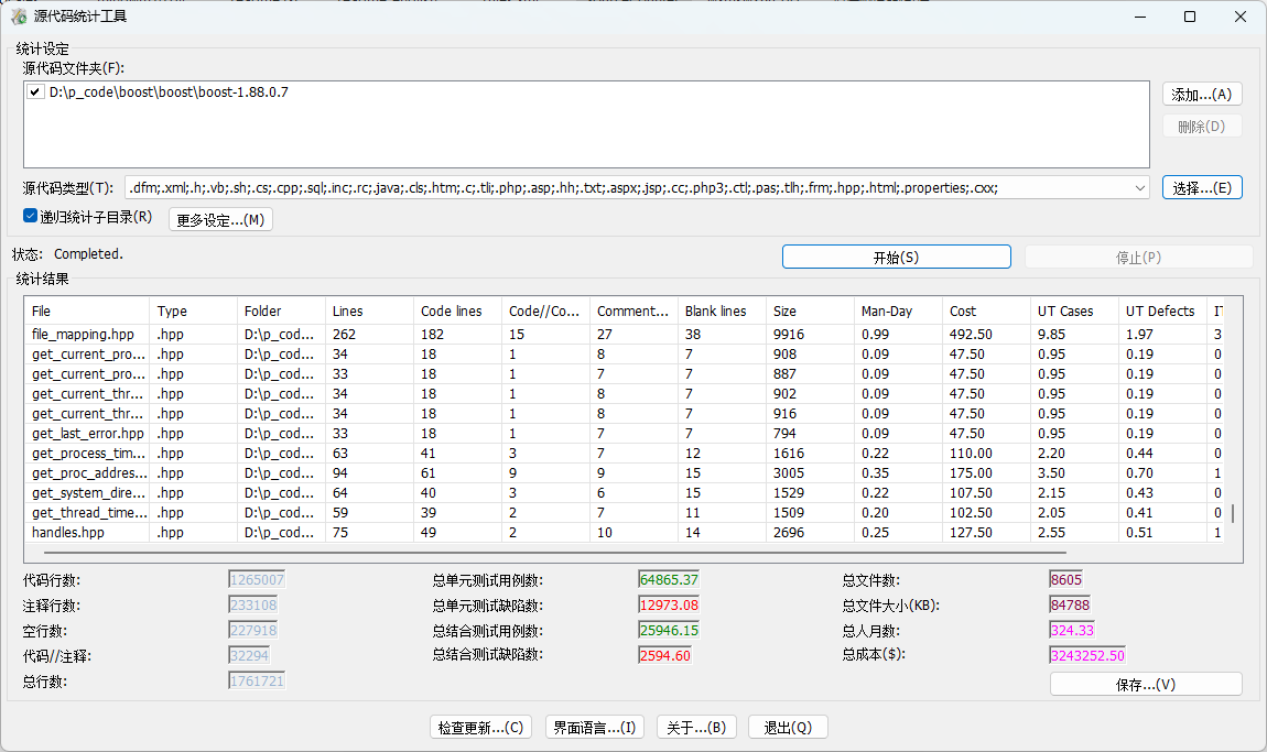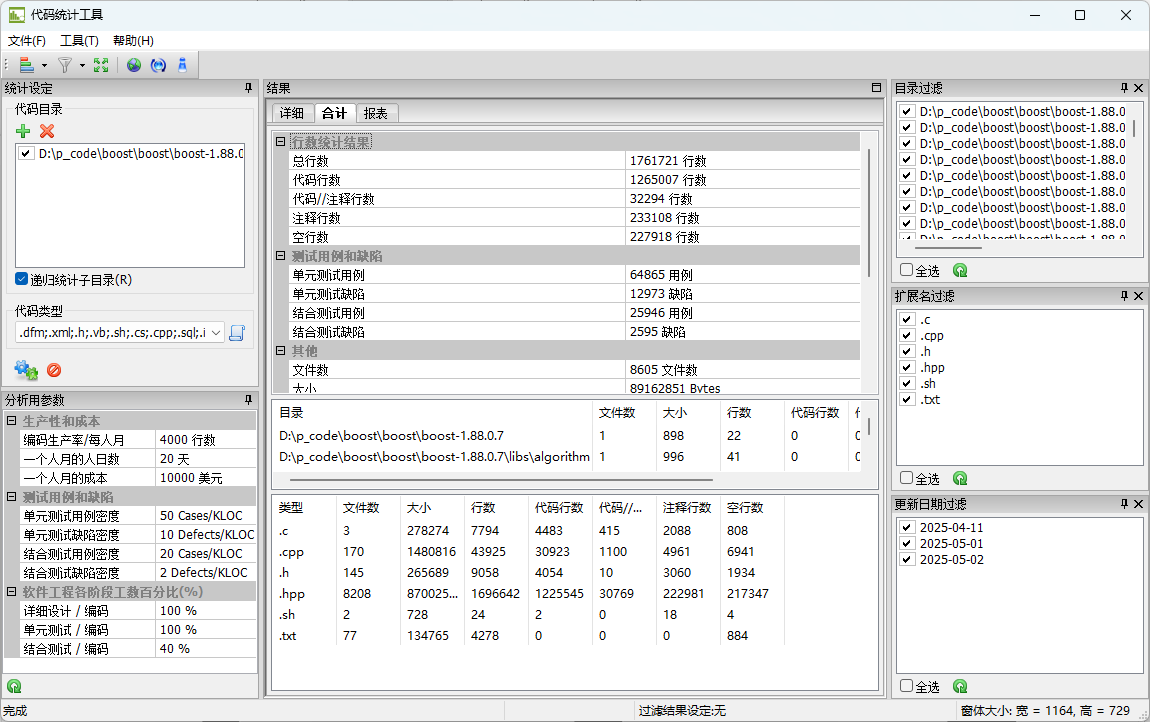 在Windows上常用的代码统计工具就是SourceCounter,该工具虽然已不再维护,但其功能齐全而且简单易用,所以我们还是推荐该软件。该软件有2.X和3.X两个大的版本,都还能还在网上下载到,两个版本各有千秋,按需选用即可。