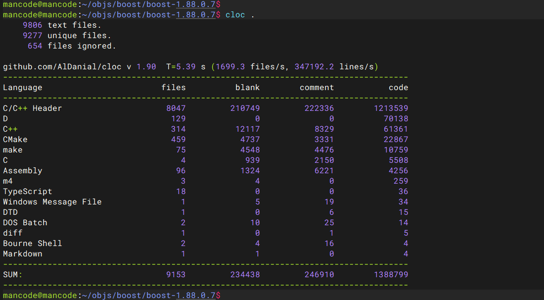最后,我们示范下cloc的简单使用方法。详细教程请参考cloc的官方文档。如下所示: