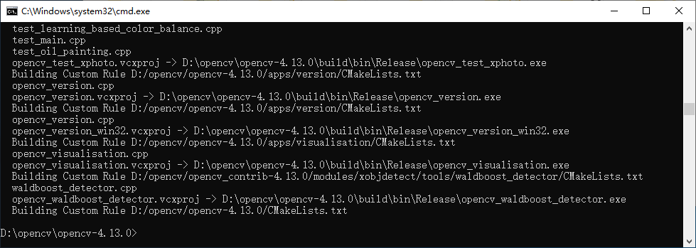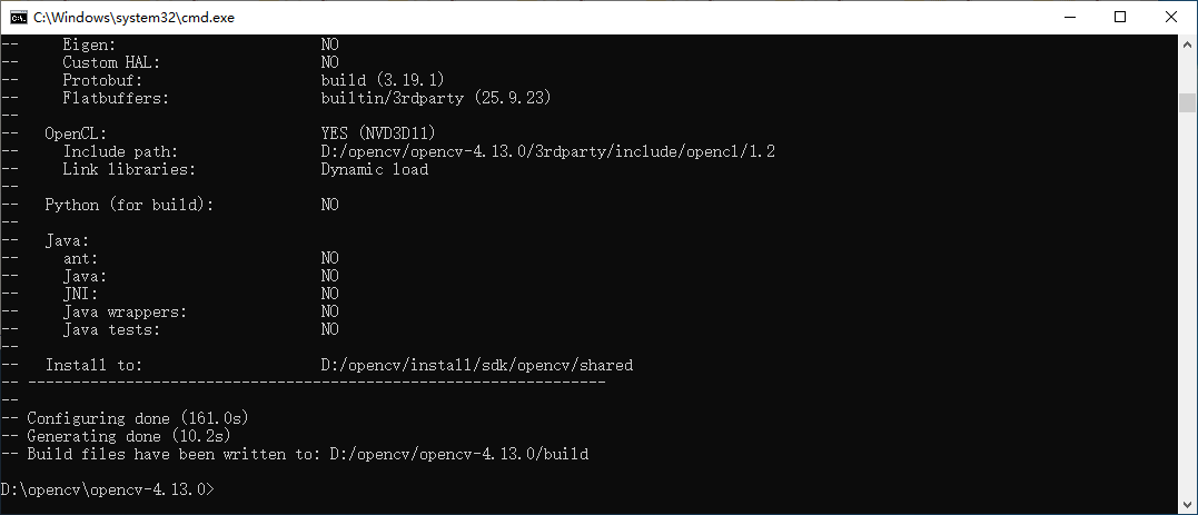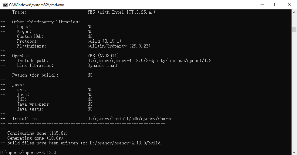 第二步:在opencv-4.13.0.tar.gz的解压目录内,使用cmake进行配置,如下命令:
