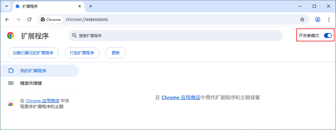 第二步,打开Chrome扩展程序管理界面,然后打开“开发者模式”。如下图所示: