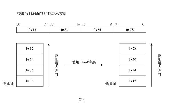 比如我们经过网络发送0x12345678这个整形,在80X86平台中,它是以小端法存放的,在发送前需要使用系统提供的htonl将其转换成大端法存放,如图2所示。