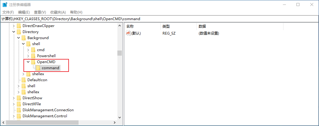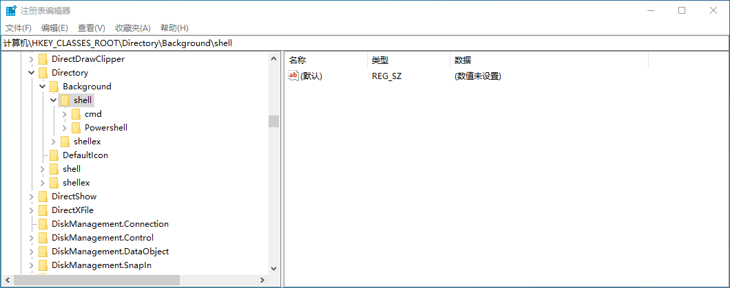 0x02,按注册表路径:计算机\HKEY_CLASSES_ROOT\Directory\Background\shell,找到shell项。
