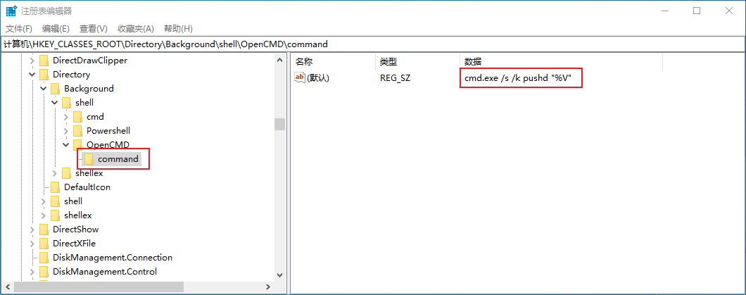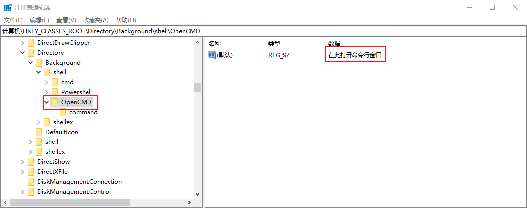 0x04,修改OpenCMD的默认项的数值为“在此处打开命令行窗口”。