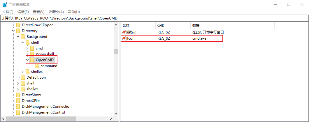 0x05,在OpenCMD项下面新建一个字符串值,名称为Icon,其数据数值为cmd.exe。
