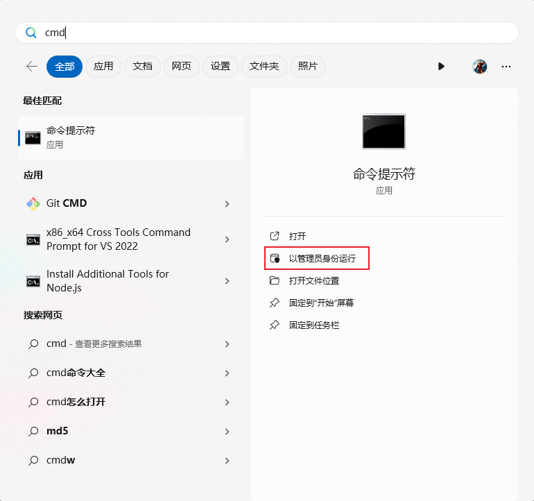 点击“以管理员身份运行”,即可打开管理员身份的cmd对话框,此处输入的命令既以管理员身份运行。