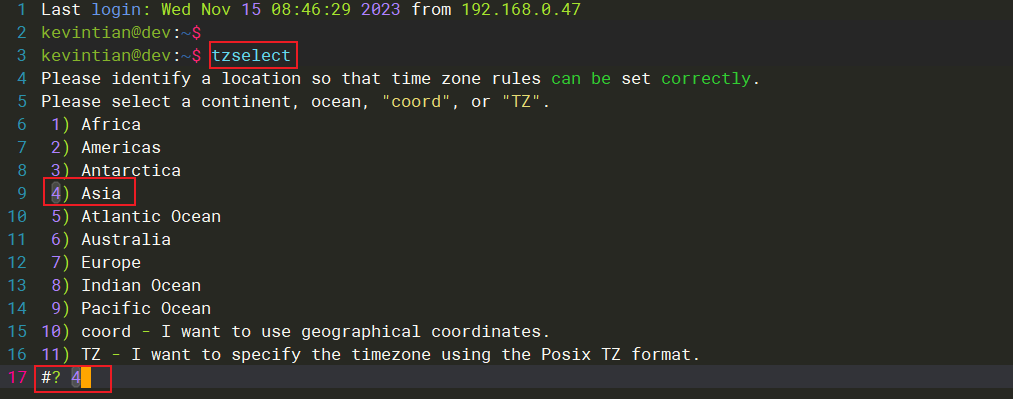 tzselect命令,通过命令行交互,列出世界上全世界,各个国家,各个城市,以及该城市对应的时区文件。