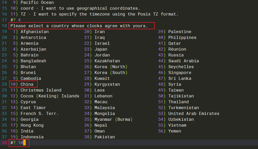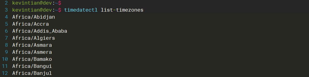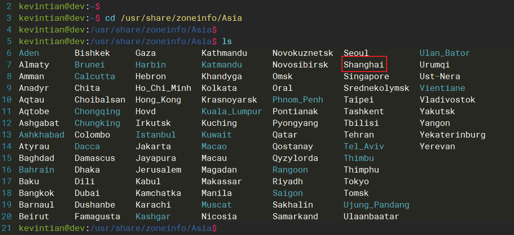 使用上述命令可以列出当前系统支持的所有可用时区,每行一个,我们顺序查找我们想要的时区。
