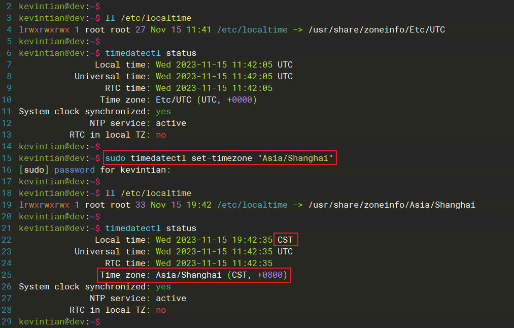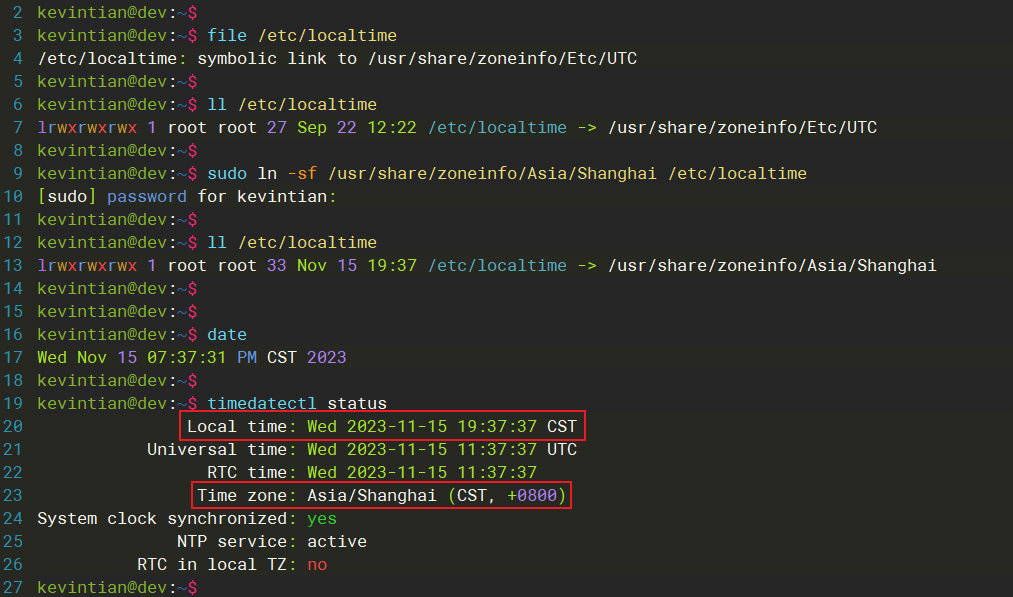 我们可以使用ln命令直接强制其指向“Asia/Shanghai”时区文件。