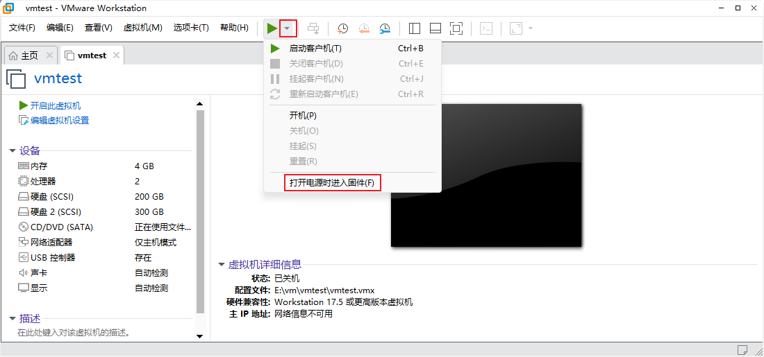 第一步,对于已安装好操作系统的虚拟机,我们在工具栏选择“打开电源时进入固件”,如下图所示: