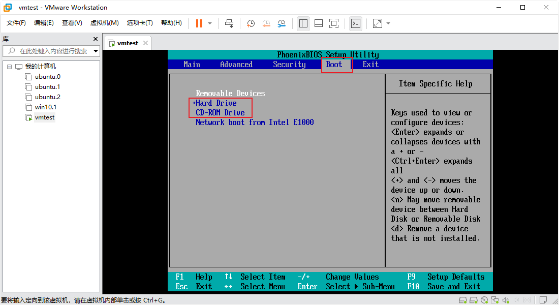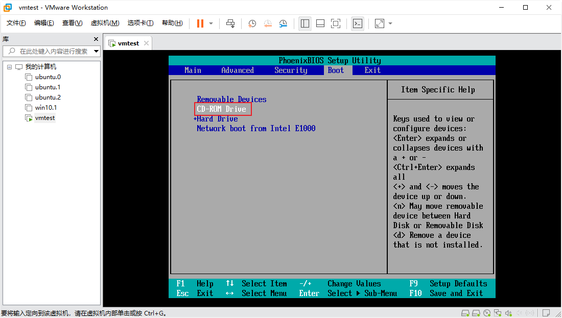 首先使用键盘方向选中“CD-ROM Driver”,然后再使用键盘的“-”或者“+”号,来调整顺序,使其先于Hard Driver。如下图所示:
