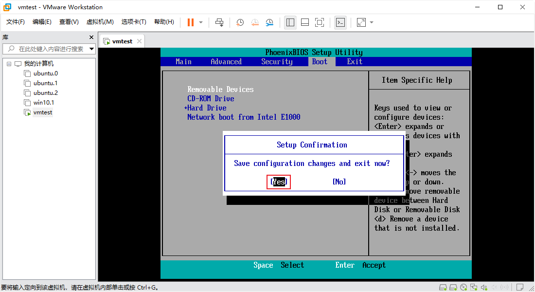 第四步,保存设置后重启虚拟机。按F10弹出保存对话框,如下图所示:
