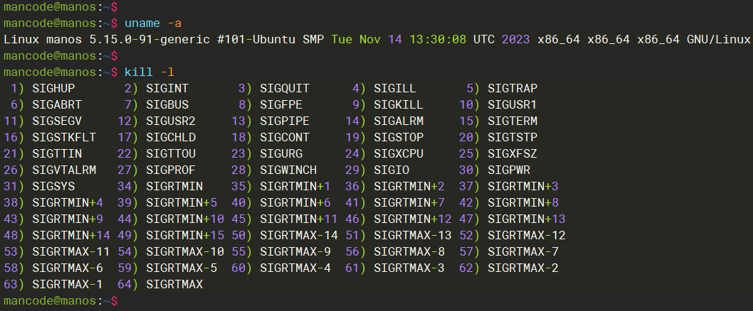 | 11 | SIGSEGV | 无效内存引用 | ✔ | ✔ | 终止+core |