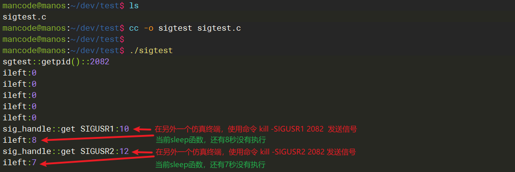 我们先启动一个终端,开始运行sigtest程序,然后在另外一个终端,向sigtest进程发送信号,执行过程如下图所示:
