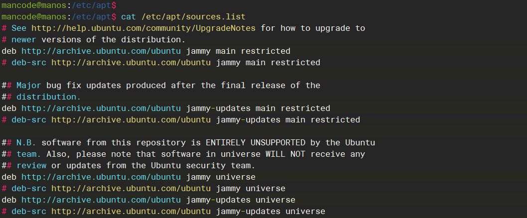 如下图所示,当前系统使用的源在/etc/apt/source.list文件中定义,我们使用