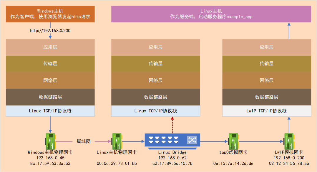 - 这个时候,我们Linux主机的物理网卡捕捉到该数据帧,将该数据包转给Linux Bridge,而Linux Bridge就如同一个交换机一般,它根据MAC转发表,将该数据包转发给 tap0,tap0 又给了 LwIP的模拟网卡。LwIP模拟网卡获取到数据,然后将数据给了LwIP协议栈,然后在LwIP的协议栈中逐层流转和处理。
