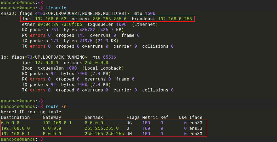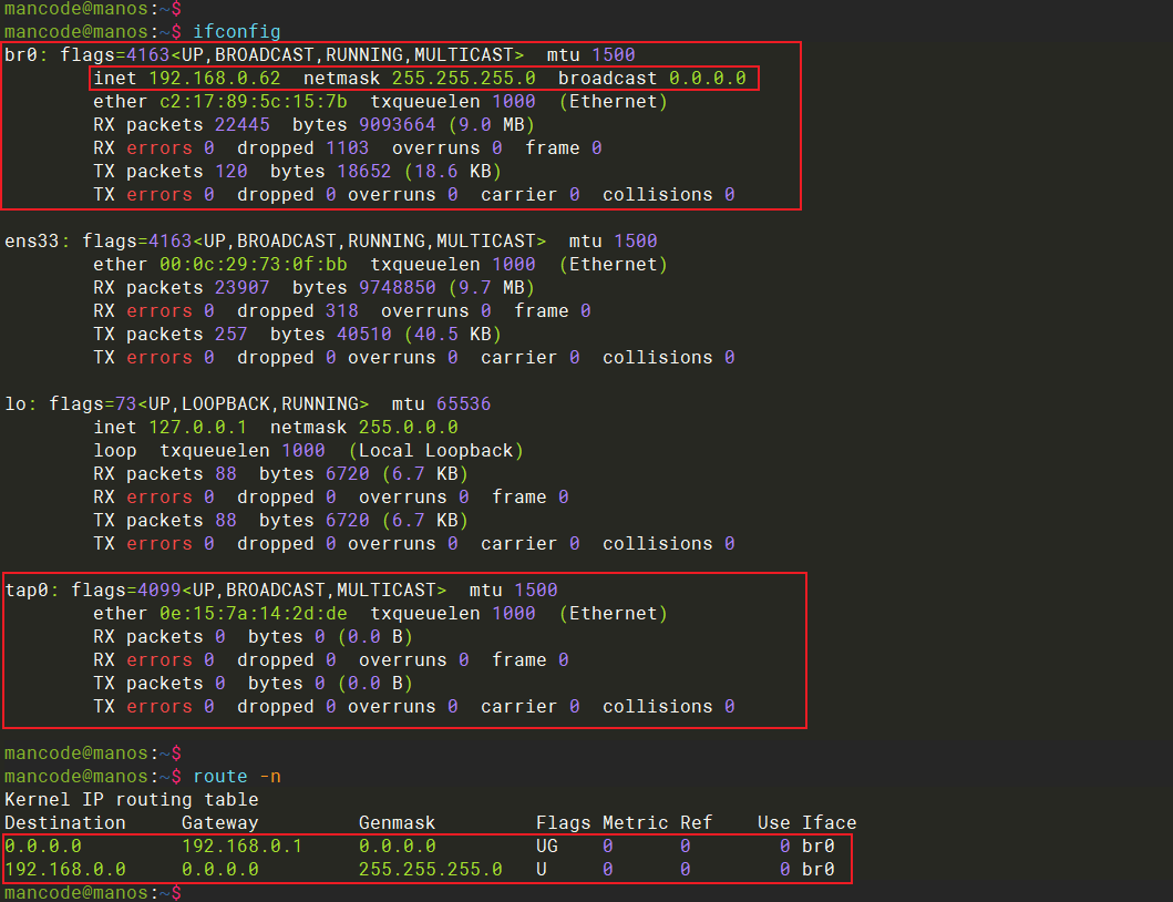 sudo ip address del 192.168.0.62/24 dev ens33进行完上述操作之后,其实原ens33物理网卡的IP已经失效,有没有已经无所谓,这里我们将其删除,以免引起误解。