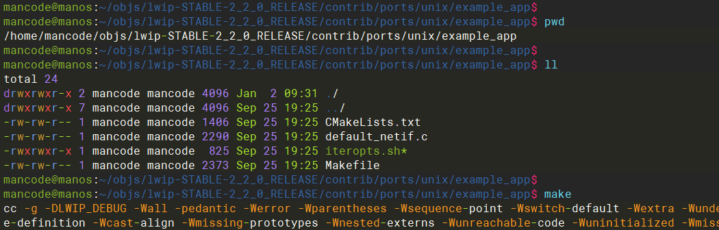 配置文件修改完成之后,进入 lwip-STABLE-2_2_0_RELEASE/contrib/ports/unix/example_app 目录,开始编译LwIP。