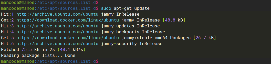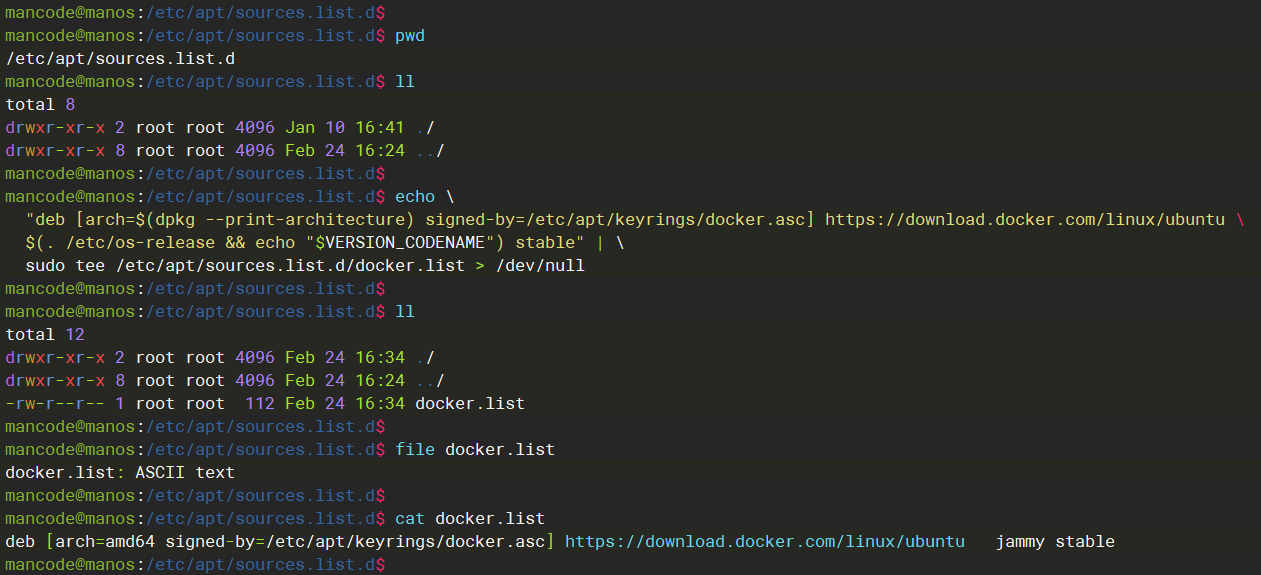 $(. /etc/os-release && echo "$VERSION_CODENAME") stable" | sudo tee /etc/apt/sources.list.d/docker.list > /dev/null