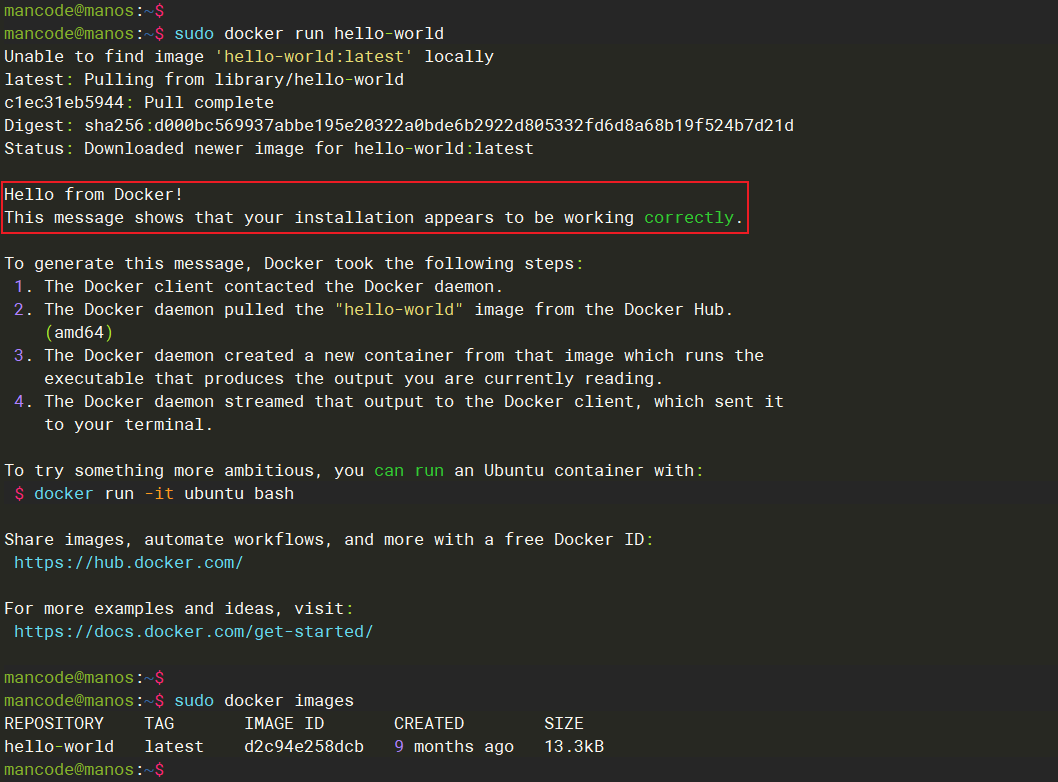 安装完毕之后,我们使用docker运行 hello-world 映像,如果正常安装和运行,会打印相关信息并且退出。
