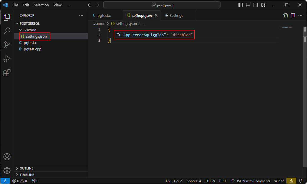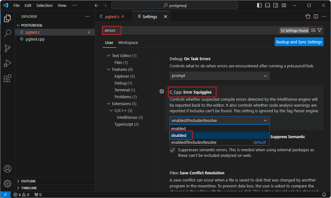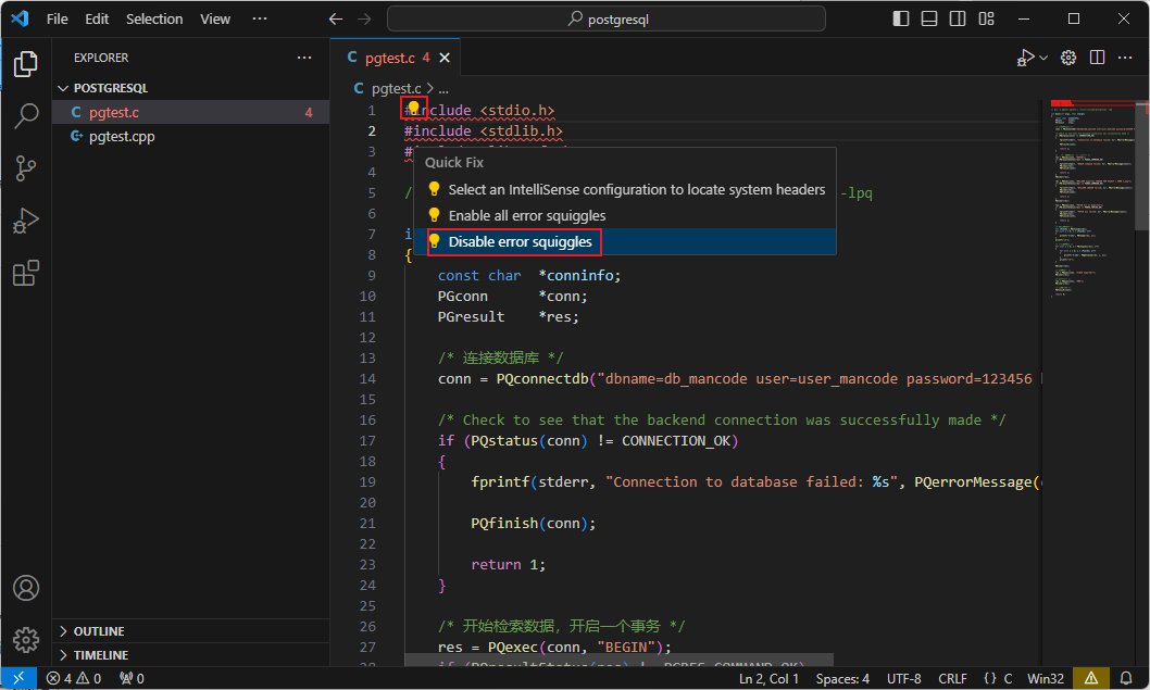 **解决方法1:**本项目内去掉提示,操作如下图所示。临时禁止之后,只对本项目起作用。会在本地文件夹内生成一个“.vscode”的目录,然后在其中生成一个配置文件“settings.json”,该文件中的配置项“C_Cpp.errorSquiggles”禁止进行提示。