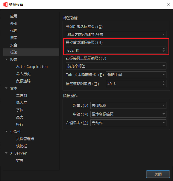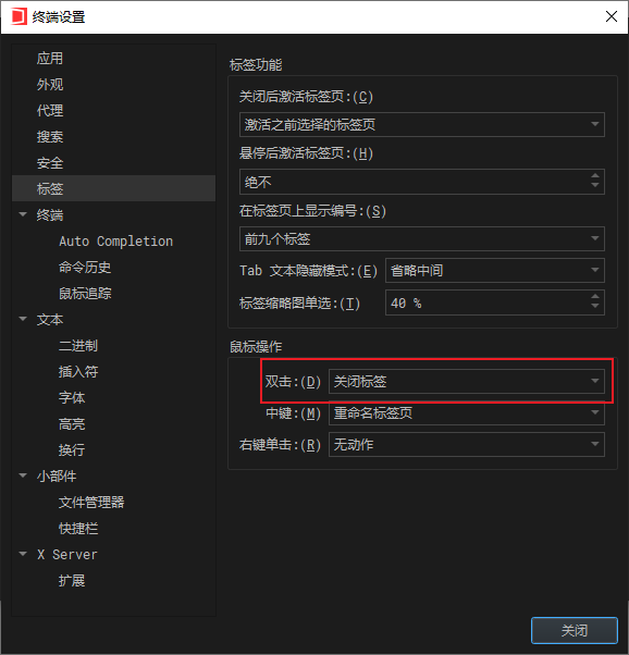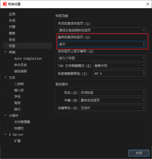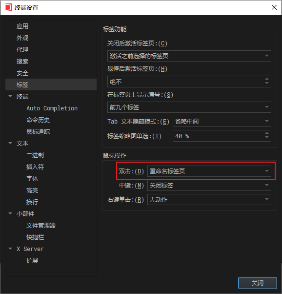 将配置窗口标签页中的“鼠标操作”的“双击”,由“关闭标签”改为“重命名标签页”。如下图所示: