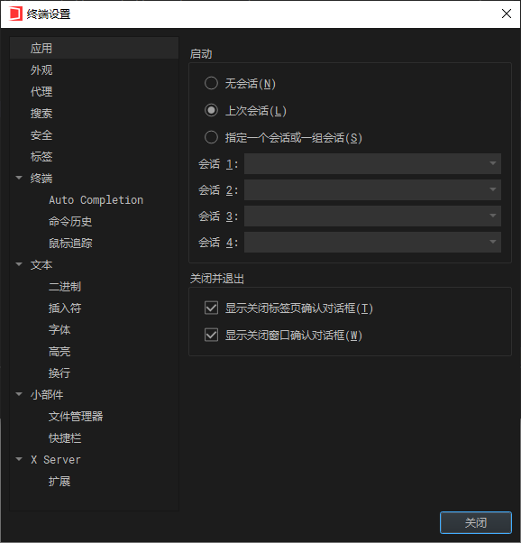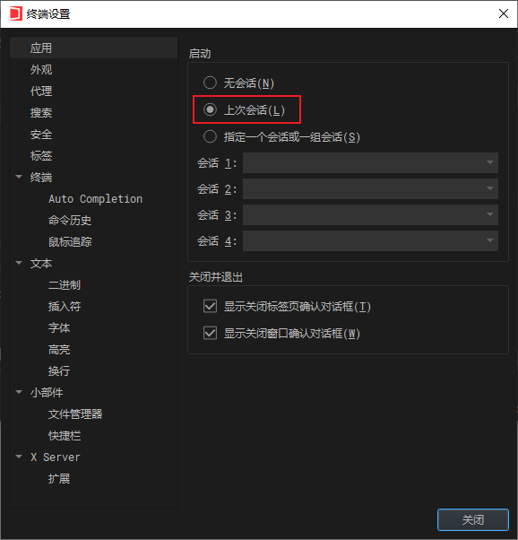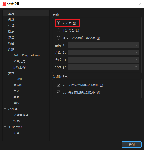 WindTerm启动时,默认打开上次没有关闭的会话。如要禁止该行为,将配置窗口中,“启动”的选项由“上次会话”改为“无会话”。如下图所示: