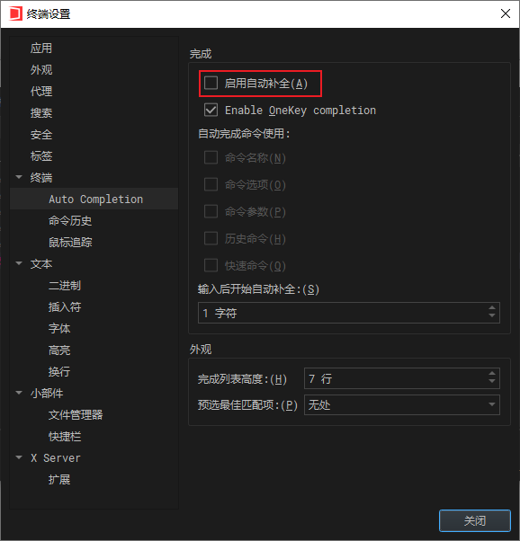 如要禁止该行为,将配置窗口中,“启用自动补全”的选项禁用。如下图所示: