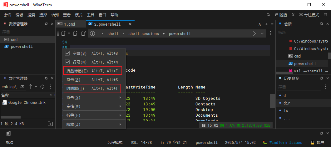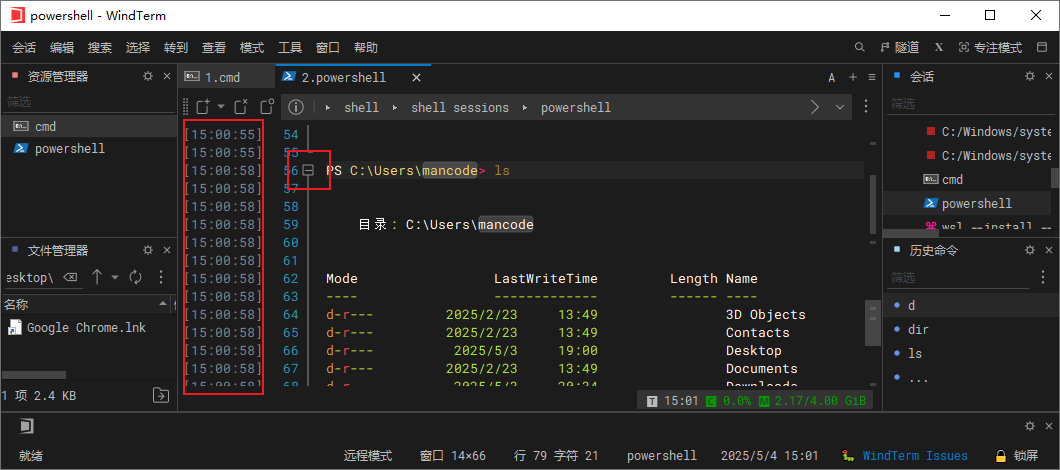 WindTerm默认显示时间戳和折叠标记,如下图所示: