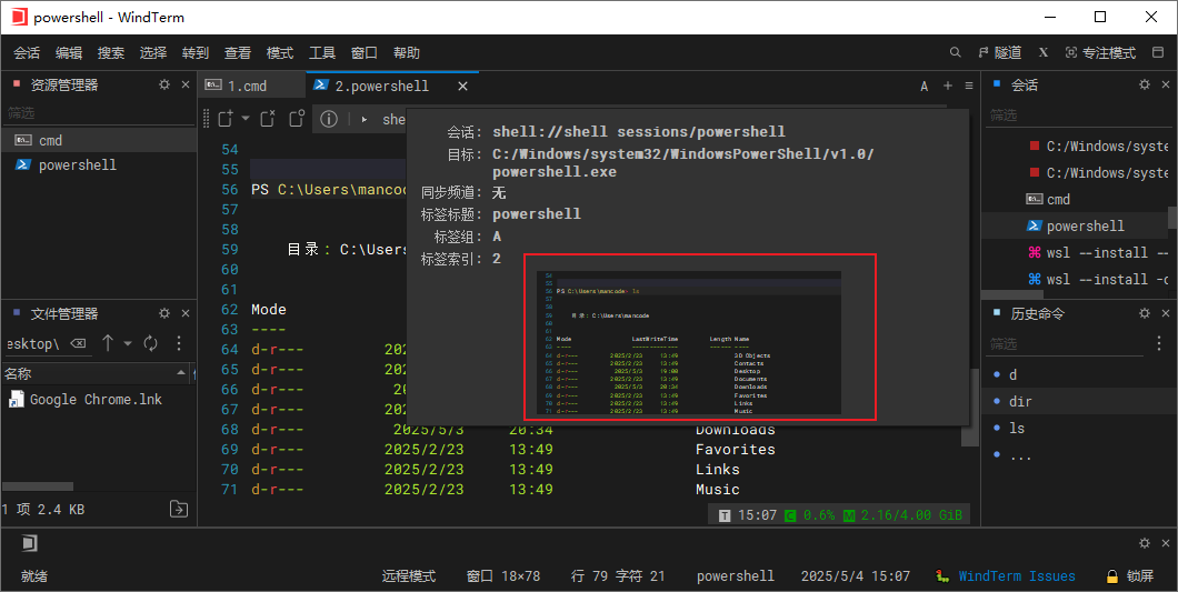 WindTerm在鼠标悬停标签时,默认显示会话缩略图,其效果如下图所示: