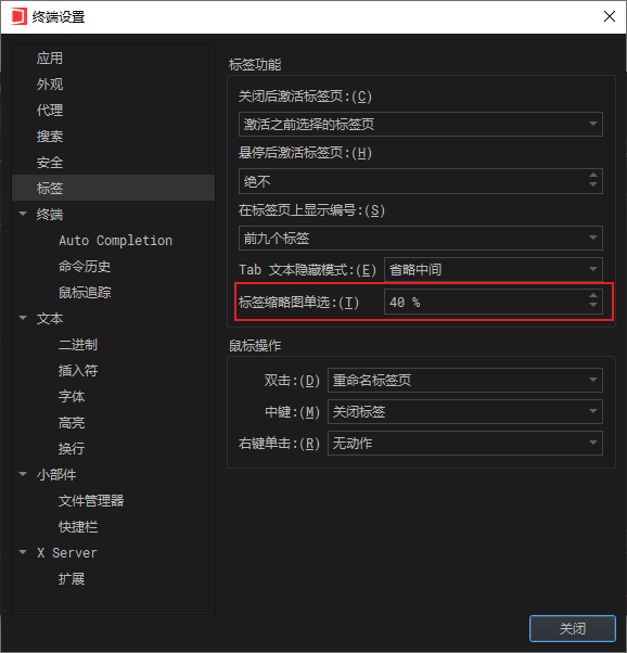 如要禁止该行为,在配置窗口中,将“标签缩略图单选”的选项由“40 %”修改为“零”。如下图所示: