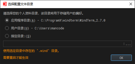 在我们首次启动WindTerm的时候,会选择存储目录或通过菜单栏 “会话” –> “首选项” –> “配置文件目录"来查询配置文件路径。如下图所示: