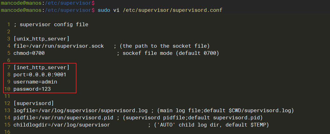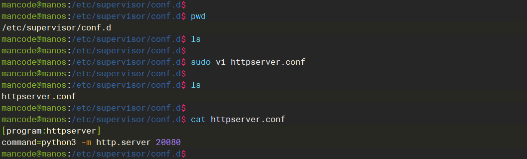 我们在 /etc/supervisor/conf.d 目录下创建配置文件,文件名称自定义即可,一般我保持配置文件名字和服务名字一致,如本例为httpserver.conf。然后在配置文件中输入以下内容: