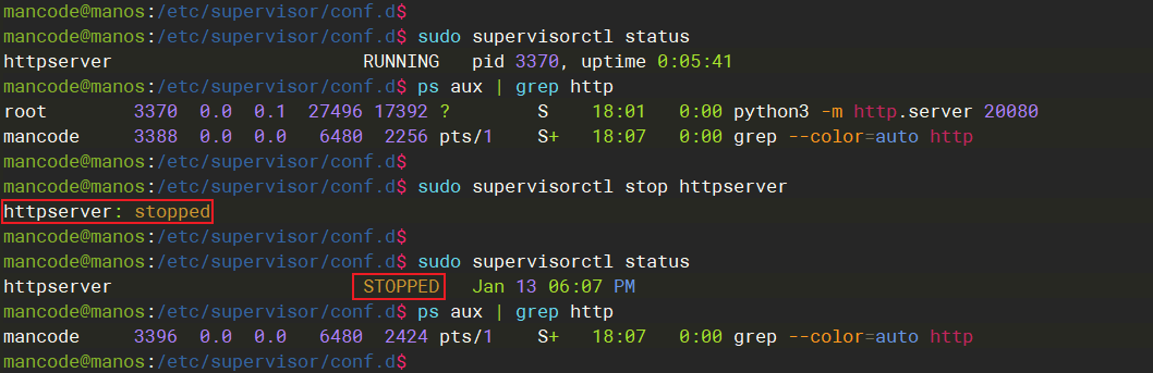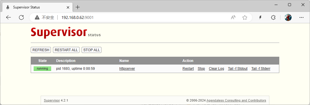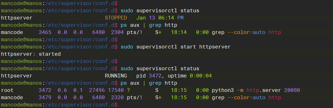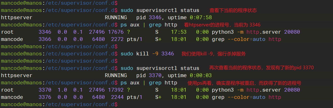 成功安装以及正确启动supervisor之后,我们使用一个简单的例子来介绍其使用方法:使用python3内置的http.server为例,让supervisor来负责http.server的启动、停止、重启以及随机启动等操作。