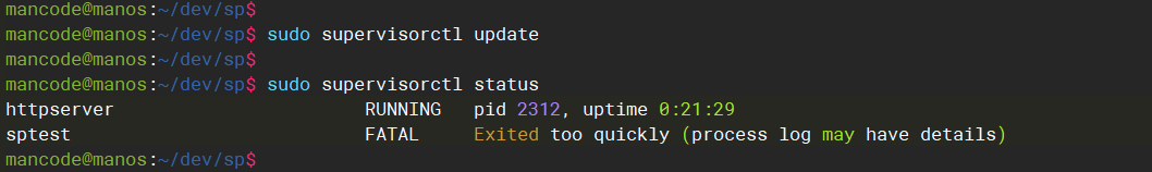 如上工作准备完毕之后,我们使用 sudo supervisorctl update 通知supervisord重新加载配置文件,然后稍后我们查看下服务状态: