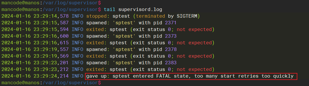 上图显示,我们的后台守护进程sptest服务,因为退出太快而被设置为了FATAL状态。我们再看下此时 supervisord 的日志: