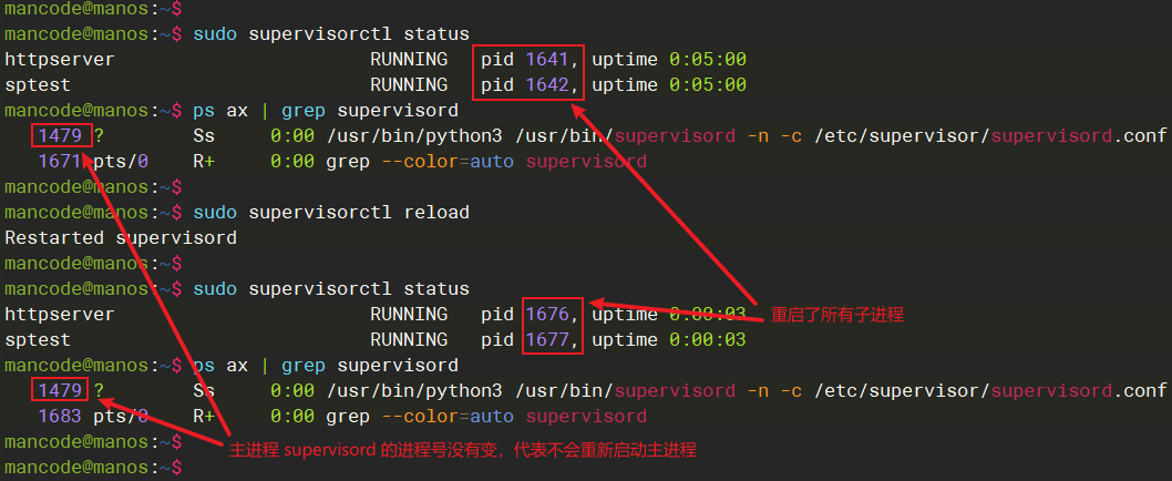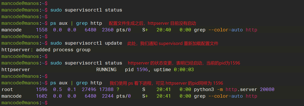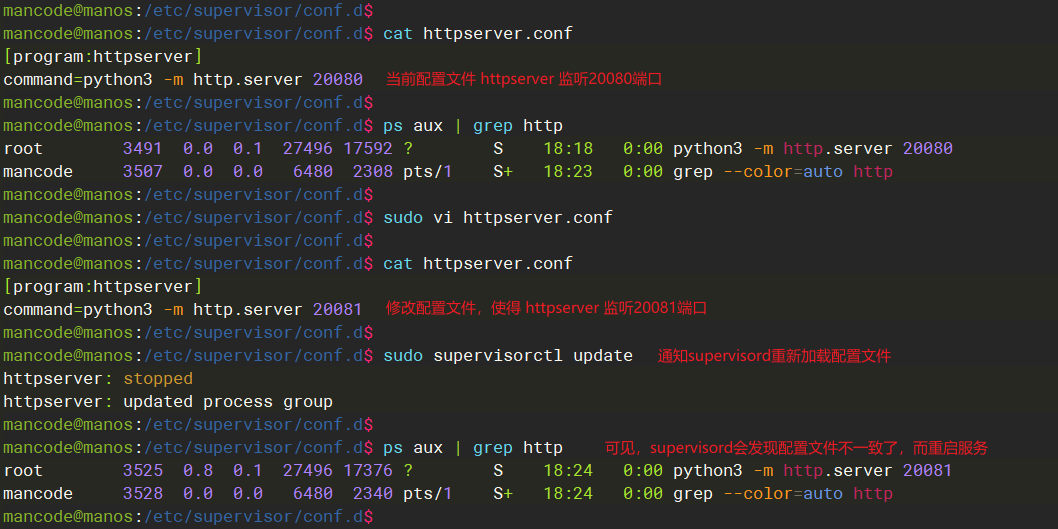 修改被管理程序配置文件,改变了该程序运行的一些属性,比如当前httpserver监听在20080端口上,我们修改配置文件让其监听在20081端口上。如果仅使用sudo supervisorctl restart httpserver,你会发现重启之后的程序依然监听在20080端口上,也就是说在supervisord不重启或者不通知supervisord重新加载配置文件的情况下,使用restart命令是不会改变已在supervisord内存中的属性。