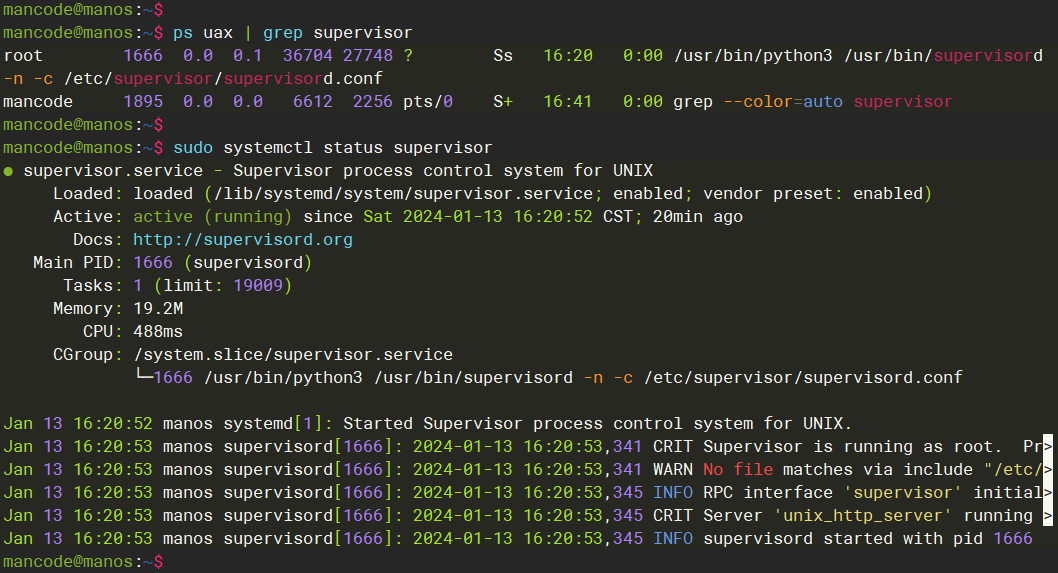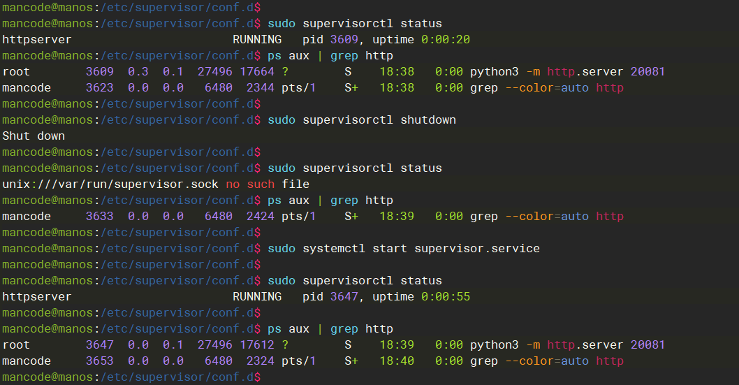 - 执行 sudo systemctl start supervisor.service 之后,会将当前其所管理的所有可随supervisord重启而重启的程序都重启