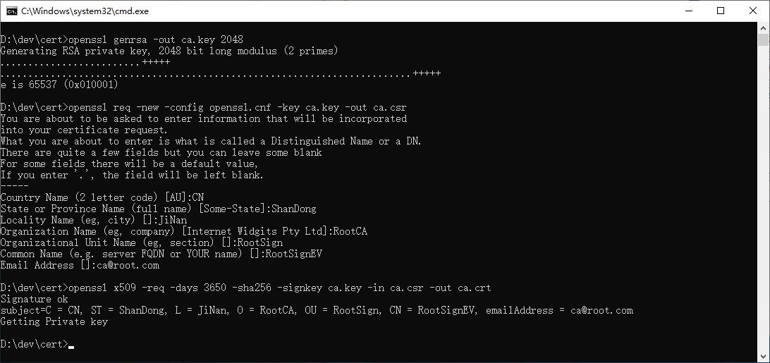 openssl req -new -config openssl.cnf -key ca.key -out ca.csr -subj "/C=CN/ST=ShanDong/L=JiNan/O=RootCA/OU=RootSign/CN=RootSignEV/emailAddress=ca@root.com"